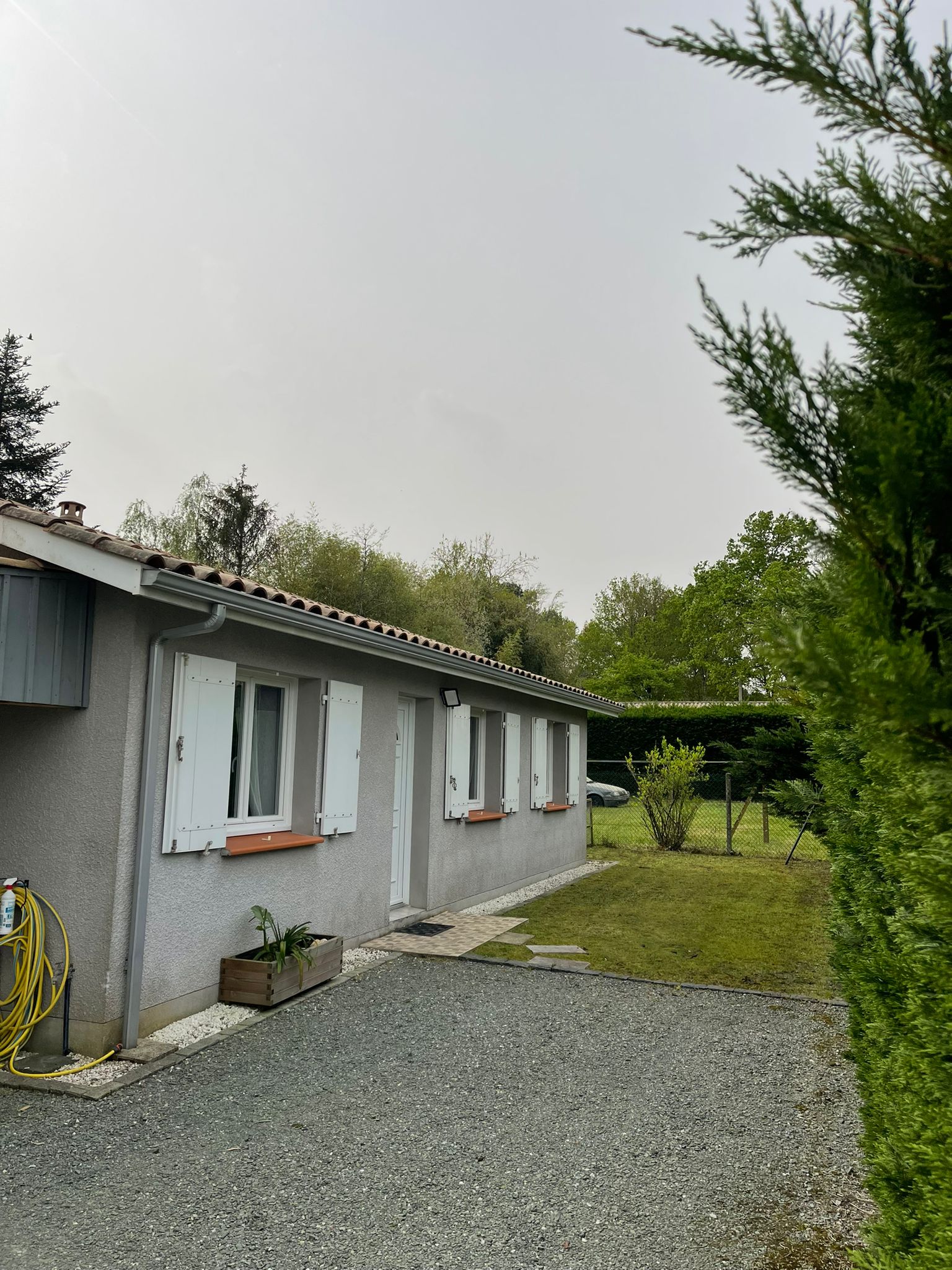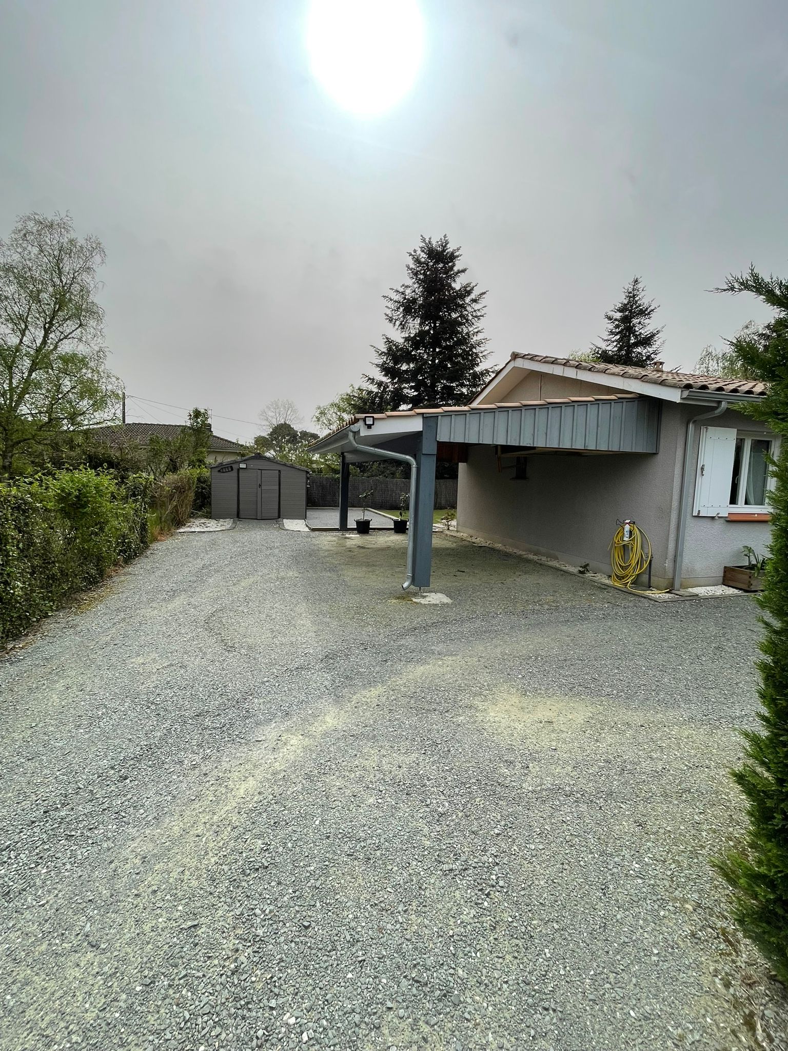 A l'exterieur, jardin avec une terasse, un abri de jardin et un terrain de pétanque. Possibilité de garer 2 véhicule sous le carport.