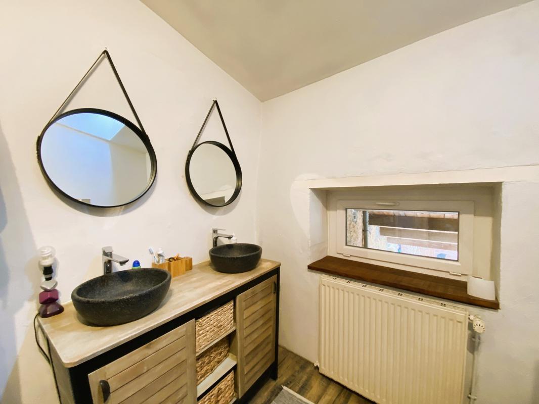 Un escalier vous mènera à l'étage où vous trouverez deux chambres de 11 m² et 13 m² avec dressing ainsi qu'une salle de bain avec double vasque. Possibilité d'une 3 ème chambre/bureau.